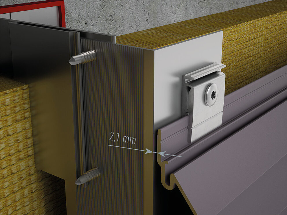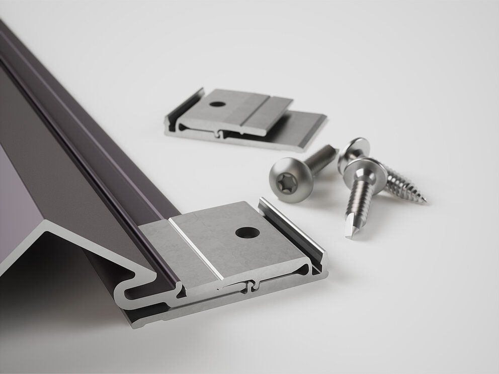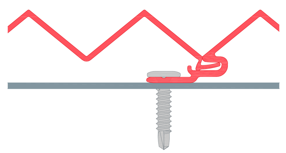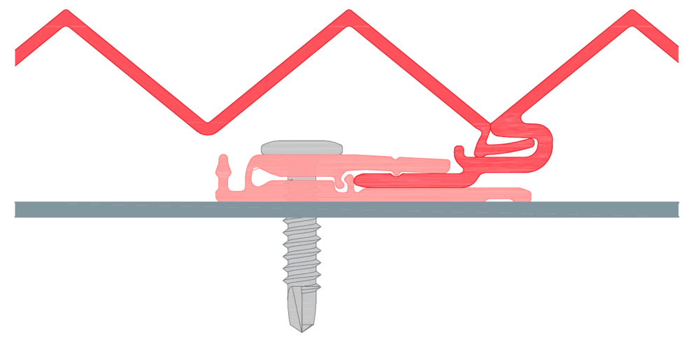 Det skjulte fastgjorte not- og fer-monteringssystem til profilbølgen og den takkede profil består af glidehæftningen og en specialskrue til underkonstruktioner af træ, stål og aluminium.