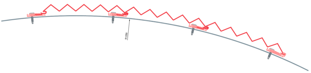 Ekstruderede PREFA-profiler kan også monteres på en rundet underkonstruktion ved lodret profilmontering. Her skal der for en byggebredde på 200 mm overholdes en minimumsradius på r ≥ 1.250 mm.
