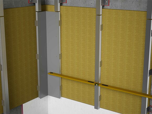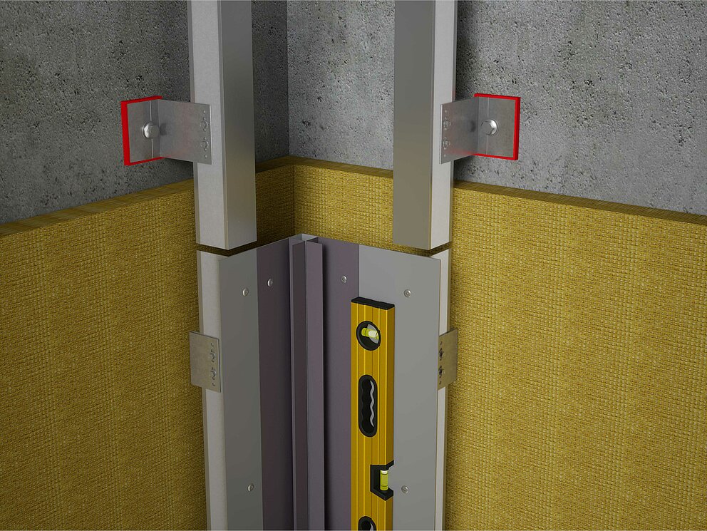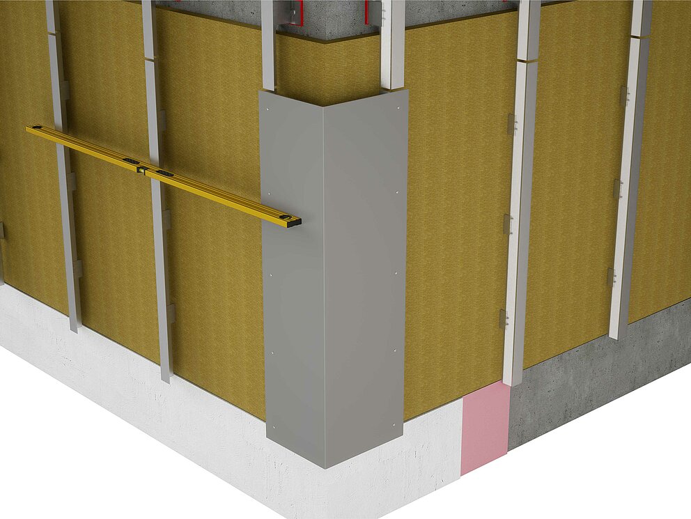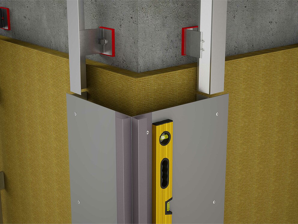 Til montering af ind- og udvendigt hjørne forberedes underkonstruktionen til horisontal profilopsætning. Montering af ind- og udvendig hjørnevinkelprofiler kræver, at den vertikale underkonstruktion først forbindes med en bærevinkel, der består af en 2 mm tyk aluminiumsplade eller en galvaniseret stålplade (1 mm). Vær allerede ved monteringen af underkonstruktionen opmærksom på at anbringe bæreprofilerne længere inde alt afhængigt af bærevinklens tykkelse for at sikre en plan underkonstruktion.