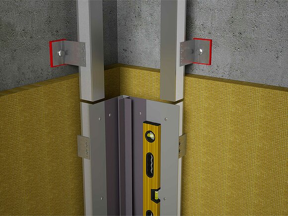Til sidst kan de ind- og udvendige hjørnevinkelprofiler monteres på kantafstivningsvinklen. Vær i denne forbindelse opmærksom på, at monteringen foretages absolut lodret og iht. den termiske forlængelse samt på placeringen af fiks- og glidepunkterne.
