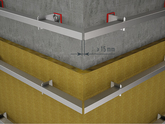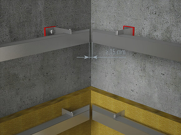 Ved monteringen af de ind- og udvendige hjørnevinkelprofiler skal sørges for, at underkonstruktionens bæreprofiler ikke støder ind i hjørneområdet. Sørg for at holde en afstand på mindst 15 mm. Ved fastgørelsen skal du sørge for, at monteringen foretages iht. den termiske forlængelse samt en klar definition af fiks- og glidepunkter.
