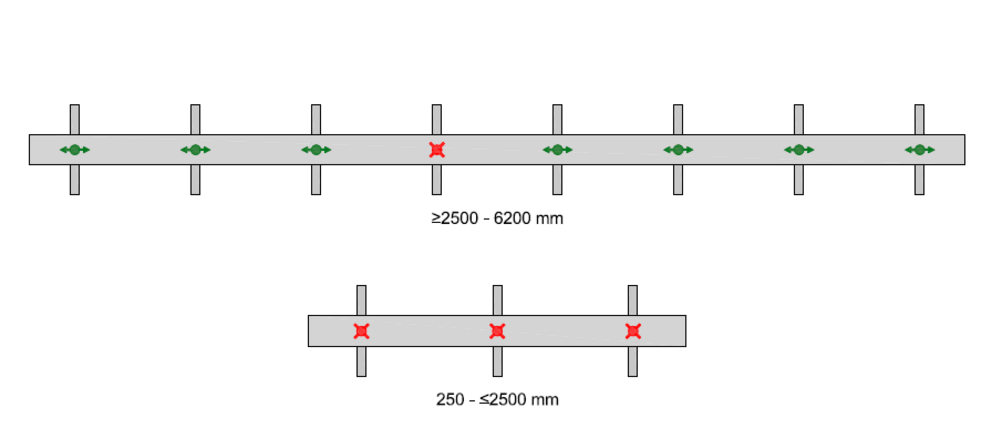 Afhængigt af længden på de ekstruderede profiler skal fastgørelsen ske med fiks- og glidepunkter. Der skal uafhængigt af monteringsretningen kun sættes et fikspunkt i midten af hver profil. Resten af fastgørelsen til underkonstruktionen foregår som glidepunkt.