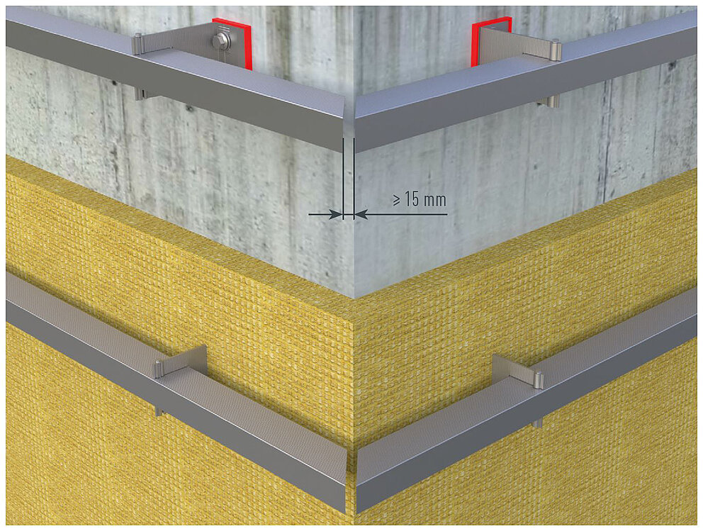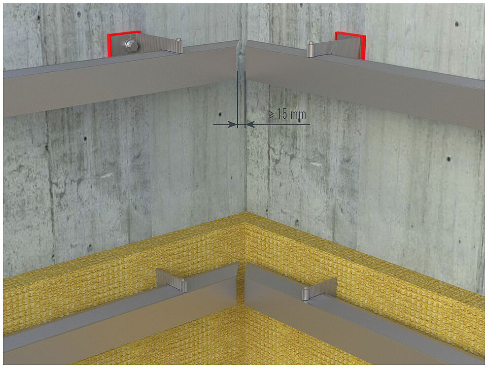 Ved monteringen af de ind- og udvendige hjørnevinkelprofiler skal sørges for, at underkonstruktionens bæreprofiler ikke støder ind i hjørneområdet. Sørg for at holde en afstand på mindst 15 mm. Ved fastgørelsen skal du sørge for, at monteringen foretages iht. den termiske forlængelse samt en klar definition af fiks- og glidepunkter.