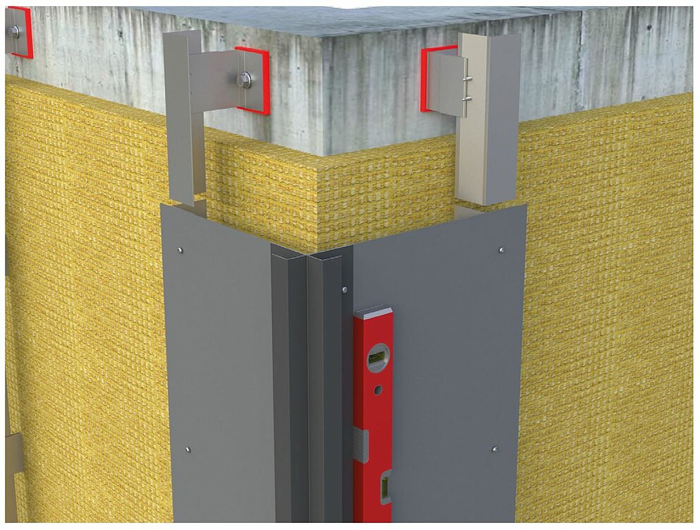 Til sidst kan de ind- og udvendige hjørnevinkelprofiler monteres på kantafstivningsvinklen. Vær i denne forbindelse opmærksom på, at monteringen foretages absolut lodret og iht. den termiske forlængelse samt på placeringen af fiks- og glidepunkterne.
