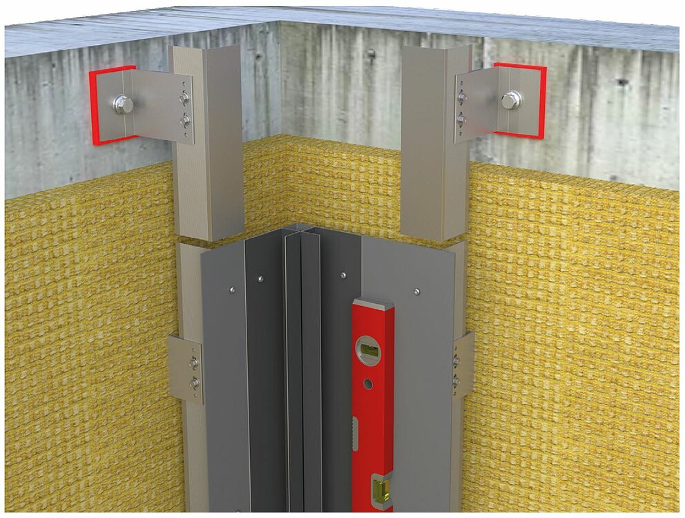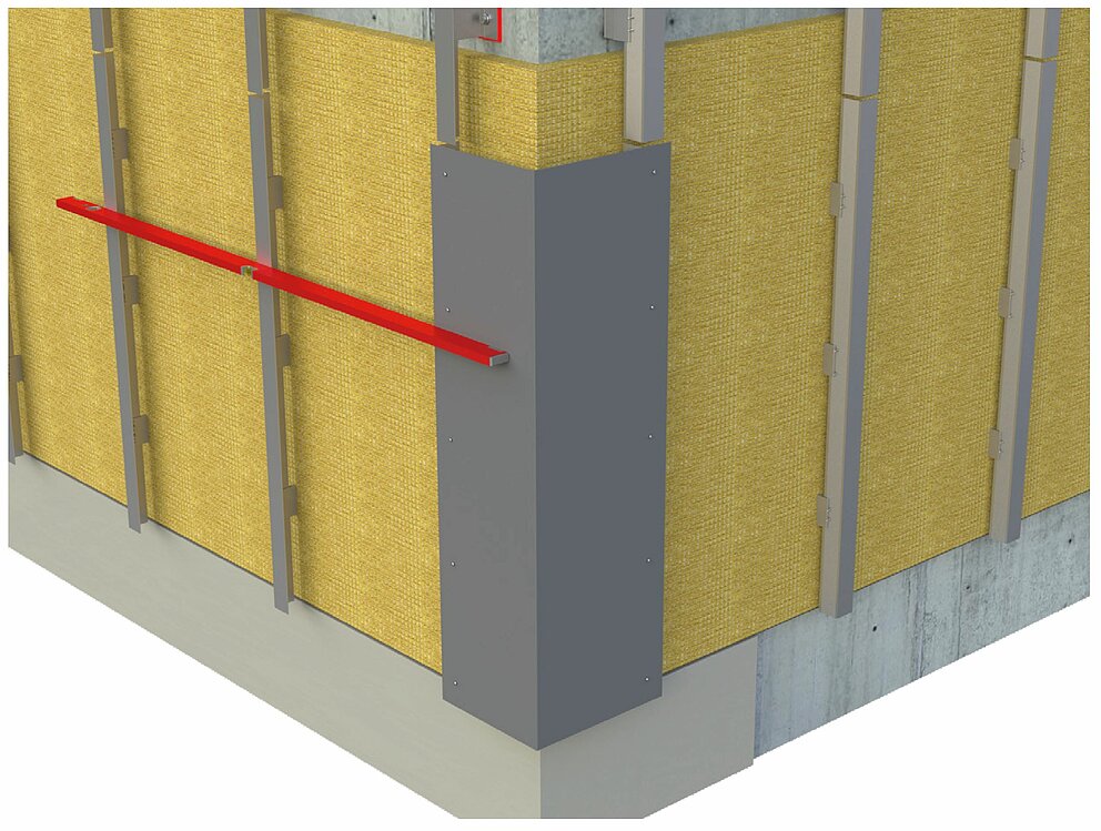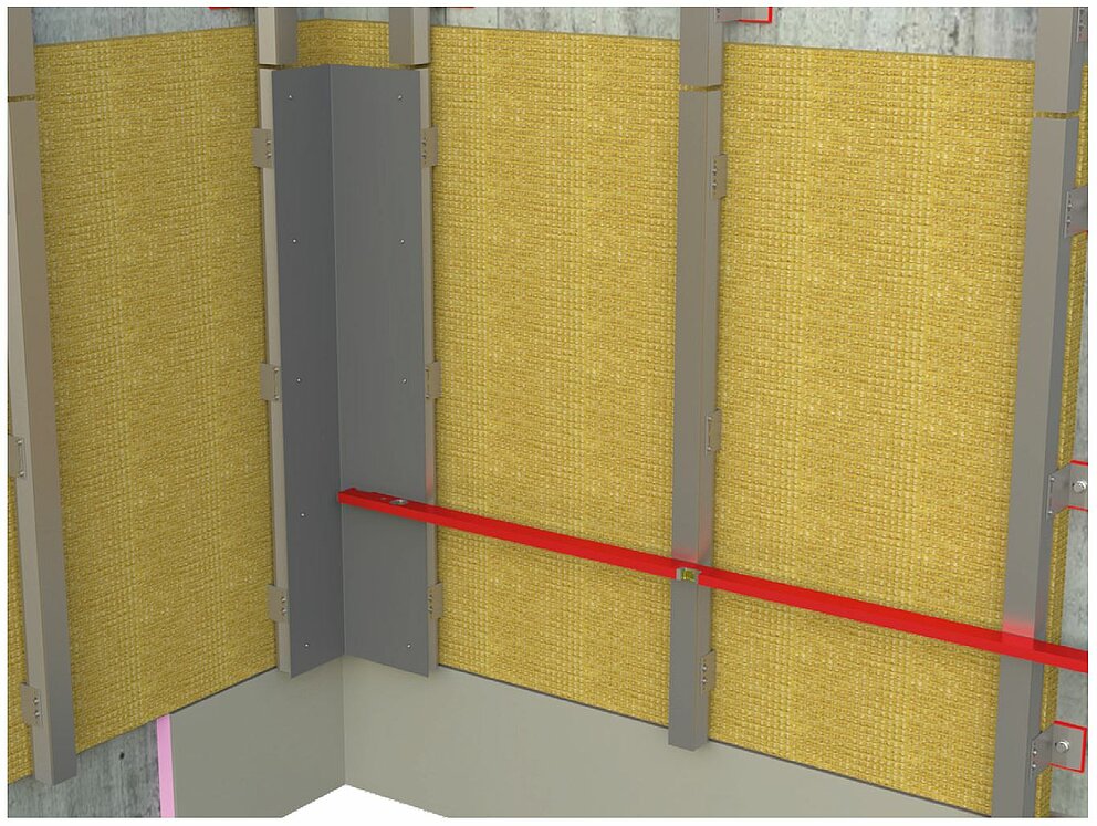 Til montering af ind- og udvendigt hjørne forberedes underkonstruktionen til horisontal profilopsætning. Montering af ind- og udvendig hjørnevinkelprofiler kræver, at den vertikale underkonstruktion først forbindes med en bærevinkel, der består af en 2 mm tyk aluminiumsplade eller en galvaniseret stålplade (1 mm). Vær allerede ved monteringen af underkonstruktionen opmærksom på at anbringe bæreprofilerne længere inde alt afhængigt af bærevinklens tykkelse for at sikre en plan underkonstruktion.