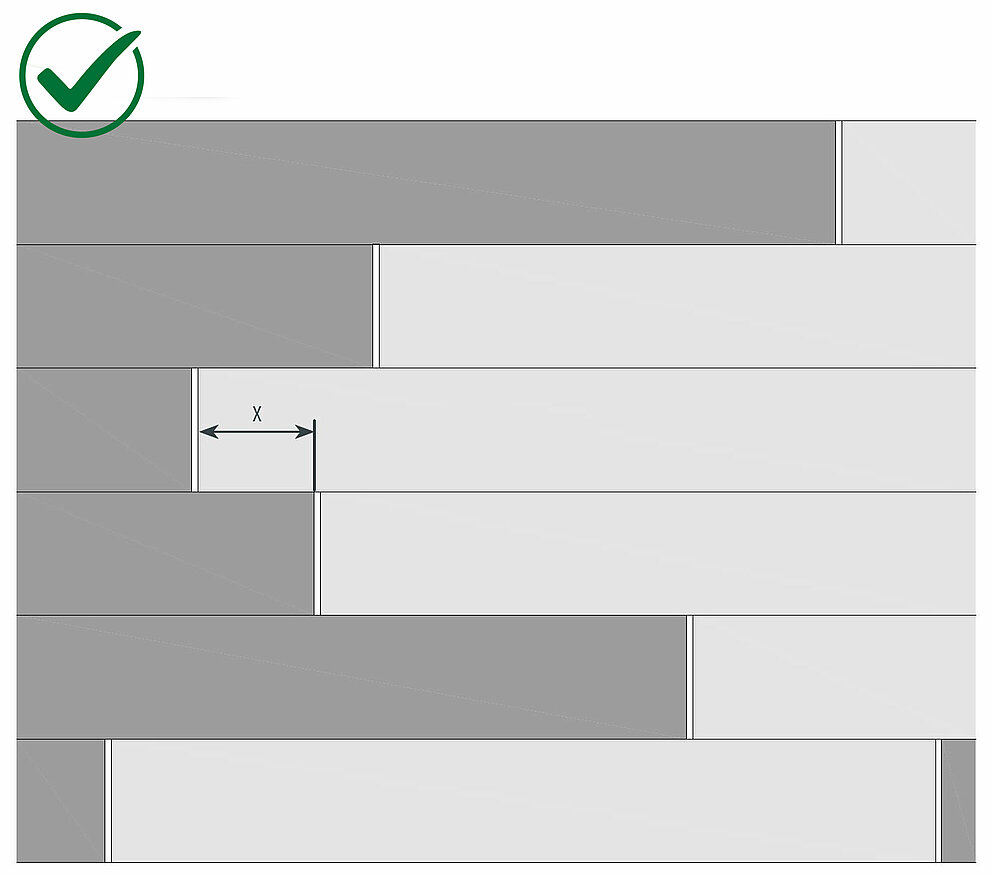 PREFA anbefaler, at forskydningen (x) mindst har en afstand, der svarer til den monterede byggebredde (BB) (f.eks. ved Siding 138 × 0,7 mm = mind. forskydning 138 mm):