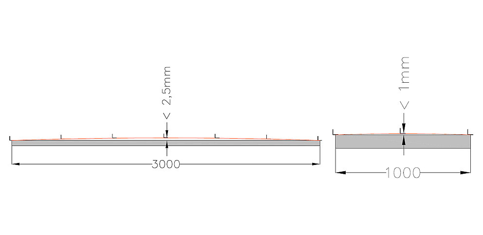 Underkonstruktionens tolerance skal begrænses til et stikmål på 2,5 mm ved en målepunktsafstand på 3000 mm hhv. 1 mm ved 1000 mm.