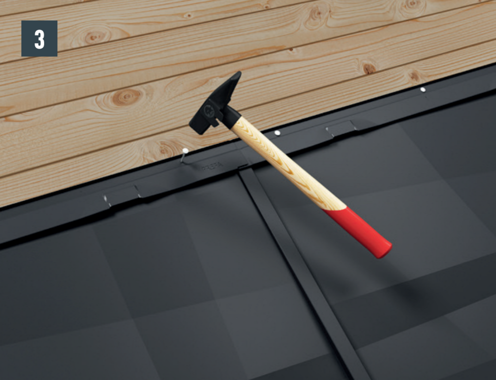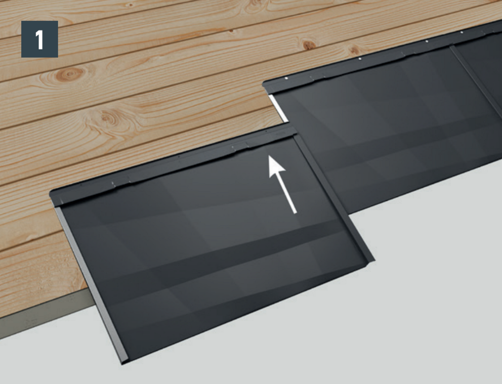 Juster facadepanelet FX.12, og skub det ind i falsene. Giv derefter panelets underkant et let stød med hammerskaftet (billede 1).