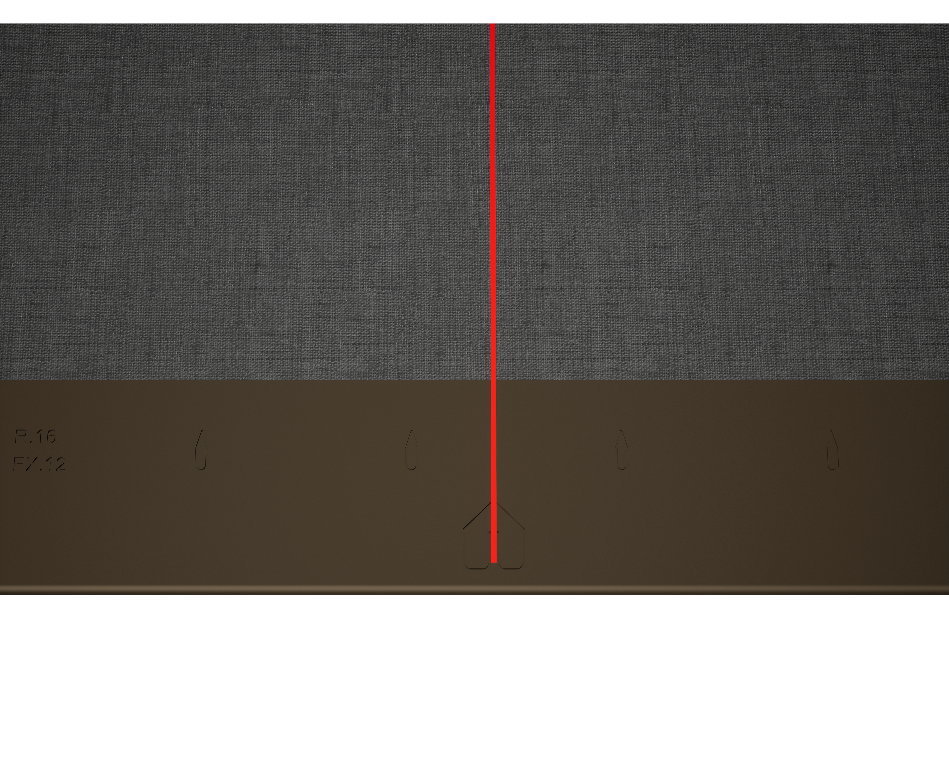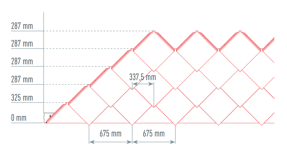 Som hjælp ved monteringen af PREFA-vægromberne 44 × 44 anbefales det at lave et mønster af lodrette snorslag i en afstand på 675 mm (markeringerne for kantlister bruges som vejledning). Ved behov kan det halve snormål også markeres og kontrolleres med regelmæssige mellemrum for at overholde snormålet i hver række nøjagtigt. Vend startpladerne med kærverne (ved startpladernes overkant) vendt mod de lodrette snorslag (se billede nedenfor). Herved skal sørges for, at området for sidekantningen (f.eks. afslutning i siden eller bygningshjørner) ikke ligger midt i vægromberne 44 × 44 (vær opmærksom på facadearealets symmetri).