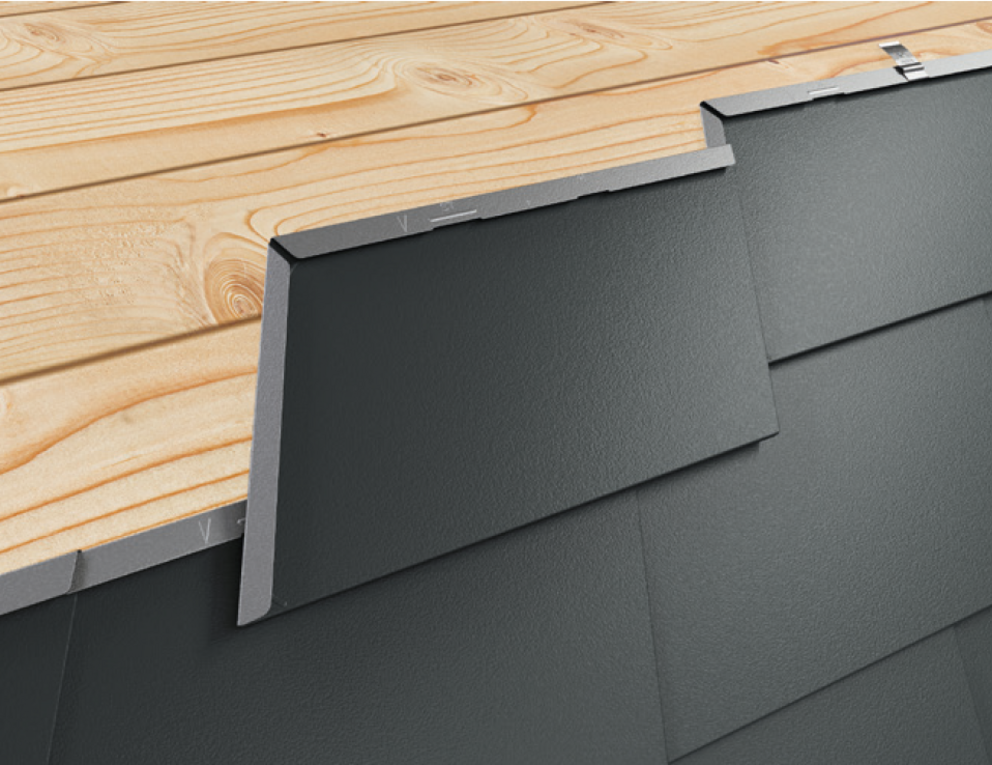 Vægspånene monteres fra højre mod venstre, og det skal foregå rækkevist (i horisontale rækker). Forskydningen fra række til række er 1/3 – Se "V"-markeringen ved spånenes øverste fals. Hver spån fastgøres med en clips og et medfølgende rillesøm 2,8/25 (= basisfastgørelse). Vægspån XL fastgøres ved hjælp af to hafter og to rillesøm 2,8/25. I områder med særlig fare for storm er en vindbelastningsberegning påkrævet, og fastgørelsen skal tilpasses i overensstemmelse med beregningen.