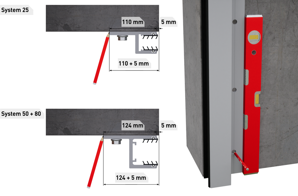 • Juster grundprofilens yderkant lodret fra målepunktet og træk den ca. 5 mm tilbage fra lysningskanten, markér og bor monteringshullerne. Før montering af grundprofilerne skal eventuelle ujævnheder udjævnes, om nødvendigt glattes eller efterbehandles underlaget.
