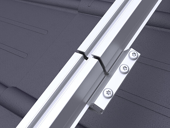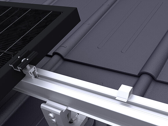 I den nederste modulrække på en generatorflade klemmes der to modulnedfaldssikringer pr. modul på den øverste modulskinne (liggende på tagsiden).