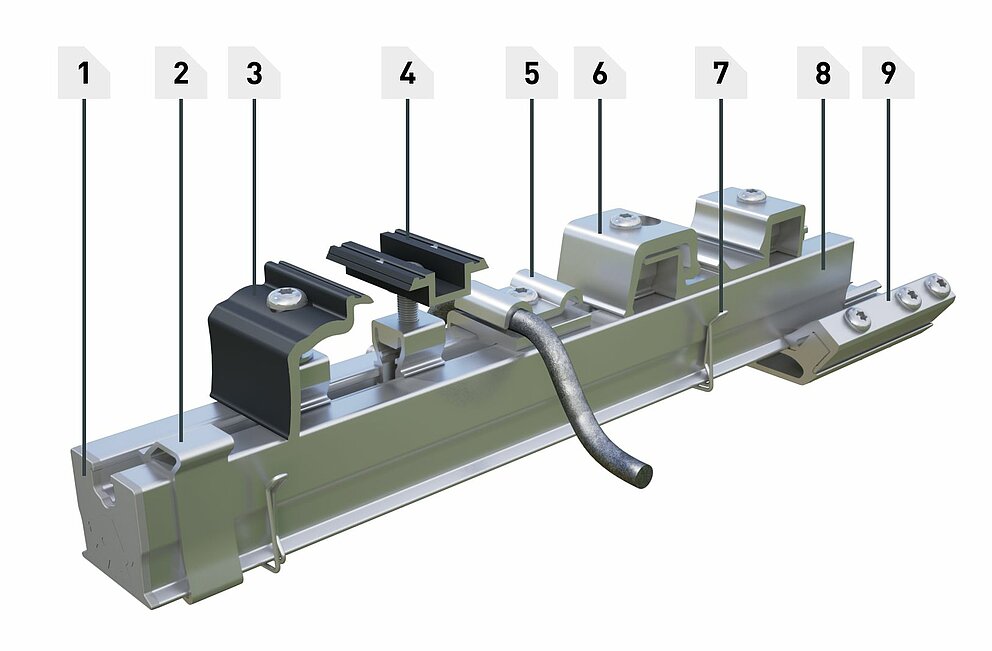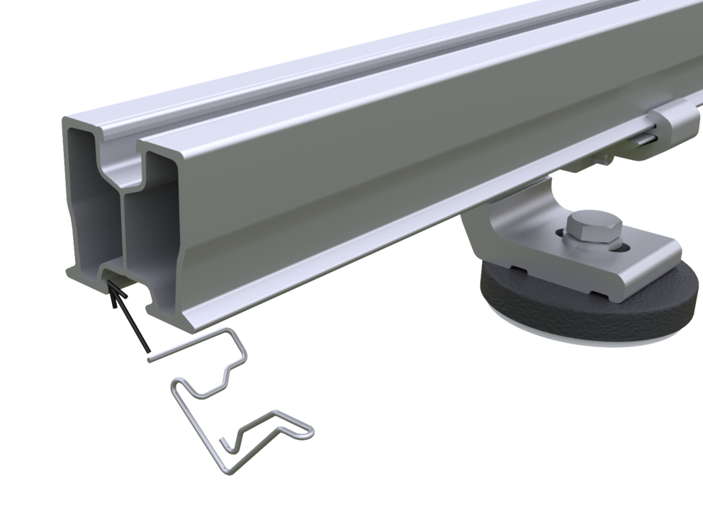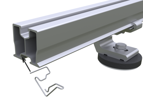 For at forhindre, at solcellemoduler styrter ned, monteres der modulnedfaldssikringer i PREVARIO-solcellemonteringssystemet. I den nederste modulrække på en generatorflade klemmes der to modulnedfaldssikringer pr. modul på den øverste modulskinne. Dermed bliver det nedfaldende modul med rammeoverkanten hængende på sikringen. En sikring, der er blevet aktiveret, udgør ingen varig montering. Berørte moduler skal omgående monteres på ny.