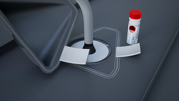 Gennemføringen af den korrugerede slange forenkles ved at behandle rørmanchetten og gennemføringsmuffen med talkum. Bøjningen af det korrugerede rør 90° i retning af tagudhænget forenkler påsætningen af sollugen.