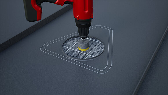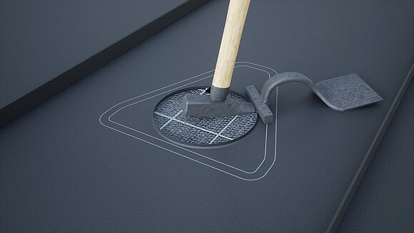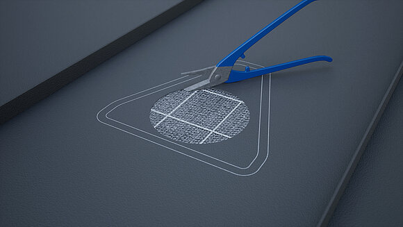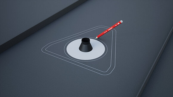 Positionering af sollugen og markering af omridset. Tegn derefter klæbeområdet (25 mm) og udsnittet til rørmanchetten. Udskær den cirkelrunde del, og buk kanten op.