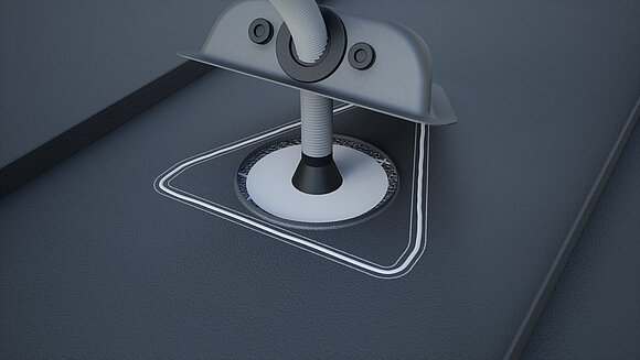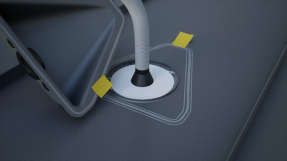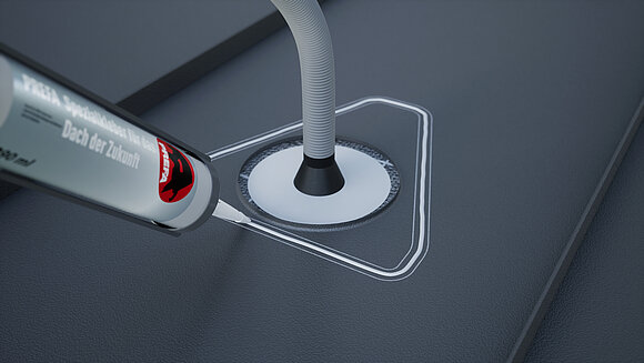 Påfør specialklæber hele vejen rundt, og før den korrugerede slange gennem muffen. Sæt derefter sollugen på og tryk den fast midtfor.