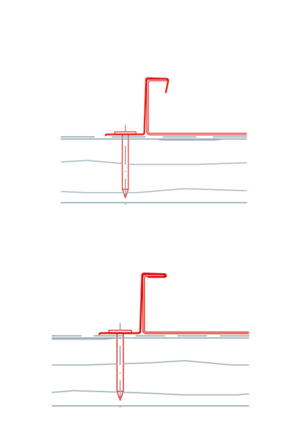 PREFA tilbyder sine egne hafter til skruefastgørelse samt tilhørende undersænkskruer. Ved udførelse med fastskruning skal der anvendes 2 skruer pr. hafte tilstrækkeligt til både fasthafte-, glidehafte- og lang glidehafte.