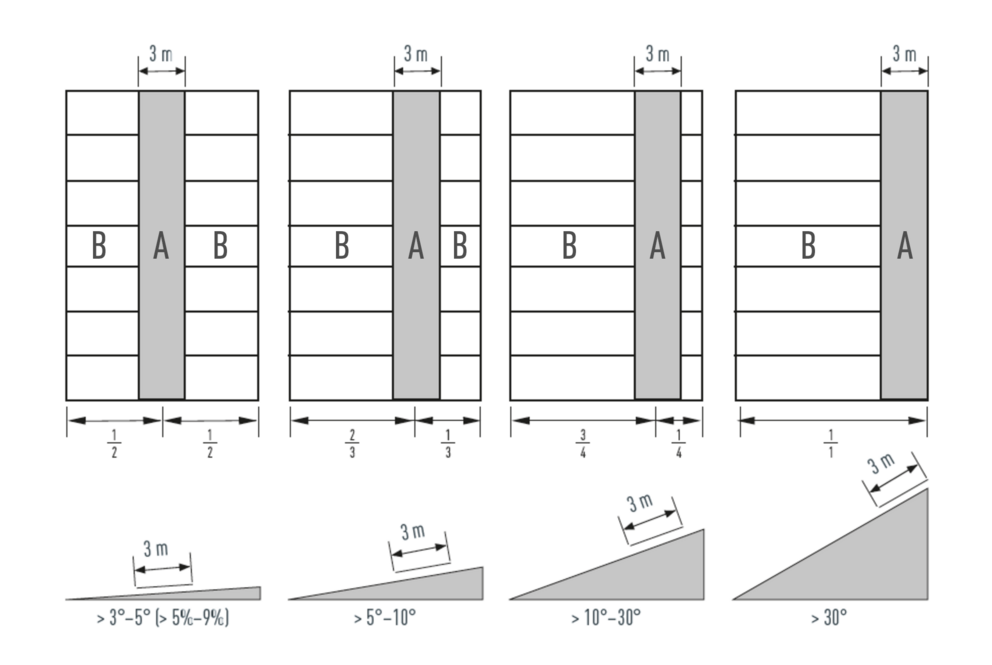 Længden af fasthafteområdet skal være 3 meter. Fasthafteområdet position skal principielt vælges afhængigt af taghældningen – se billede nedenfor samt den tilhørende tabel. Gennemføringer eller tagformen kan påvirke hæftningsområdets position. Områder med forskellige positioner for hæftningsområdet skal adskilles af skillelister.