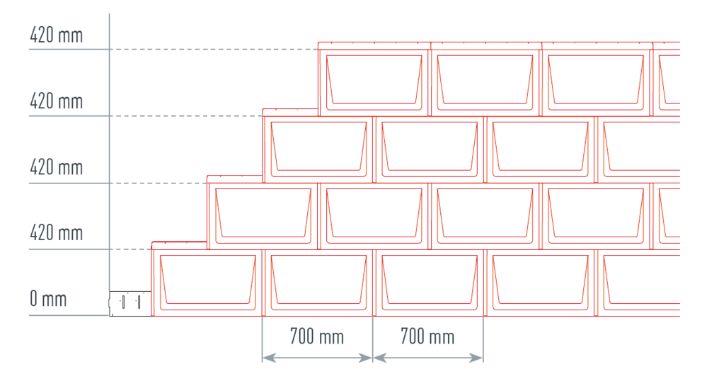 Vertikal opmåling: 700 mm (hver anden række forskudt med 350 mm)