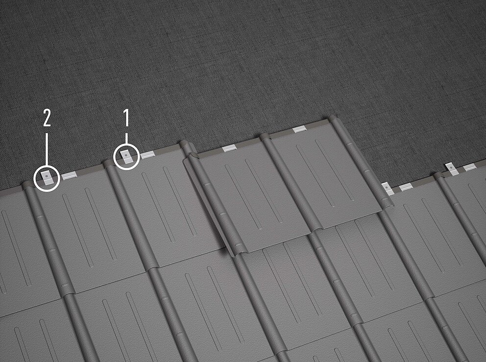 Fastgør hver plade med to patentclips (standardfastgørelse). Fastgørelsen af patenthafterne udføres med ét rillesøm 2,8/30 eller 2,8/25 pr. hafte. Hvis der anvendes kraftigere skillelag, skal der om nødvendigt anvendes længere søm.