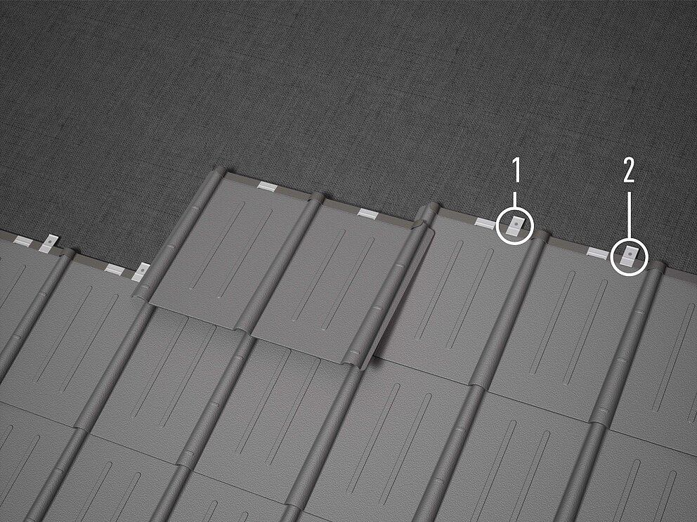 Hafterne skal sættes ca. 3 cm ved siden af pladerillen. I områder med særlig fare for storm er en vindbelastningsberegning påkrævet, og fastgørelsen skal forøges i overensstemmelse med beregningen, eller fastgørelsen skal udføres med skruer i stedet for med søm. Hvis fastgørelsen med et forøget antal clips ikke er tilstrækkelig i henhold til beregningen, kan der derudover anbringes en direkte fastgørelse på siden af bølgeudløbet (den underliggende bølge) med 2 stk. halvrundhovedskruer (4 x 25 mm) pr. plade. Placeringen af hafterne afhænger af læggeretningen. Patentclipsene til tagplader og tagspån er forsynet med en yderligere granulering. Denne granulering gør det lettere at slå søm igennem, hvis det ikke er muligt ved det fastlagte hul (f.eks. på grund af et knasthul eller en spalte i forskallingen).