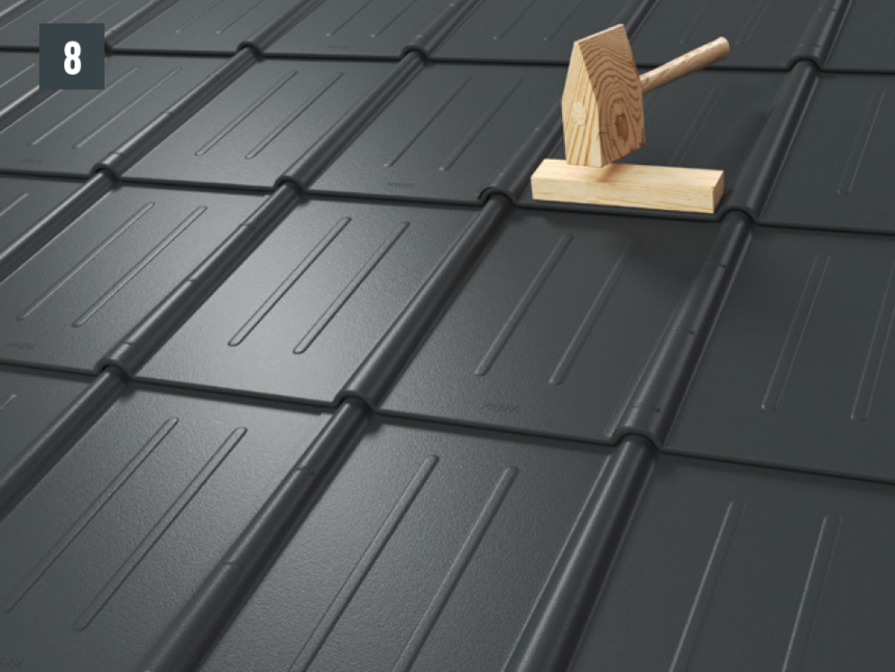 • Tryk de to false forsigtigt sammen med den bøjede falstang. Indarbejd pladens øverste fals med hammer og tang (billede 7).