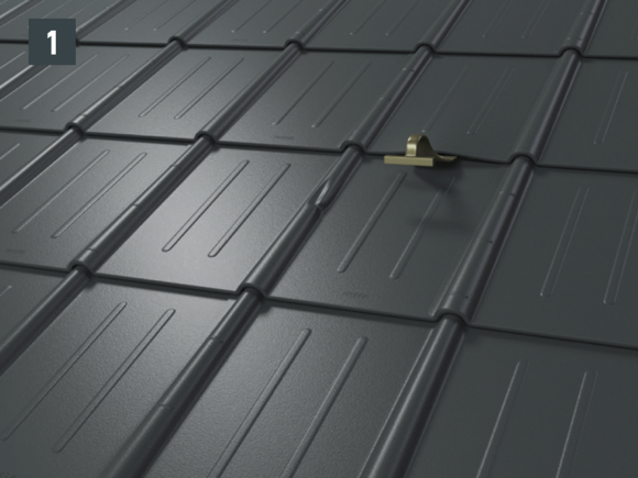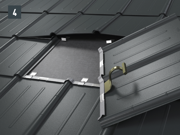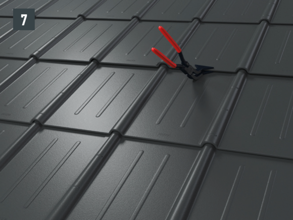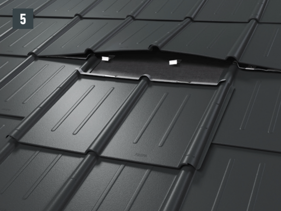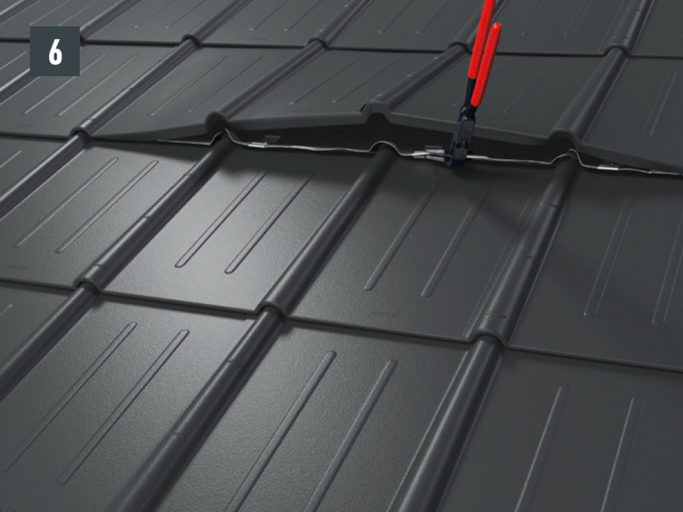 • Afspænd de to øverste riller, før den nye tagplade skubbes ind, og åbn den øverste fals lidt. Den nye plade kan lægges over de andre med begge sideriller (billede 5) – undtagelse: i kileområdet.