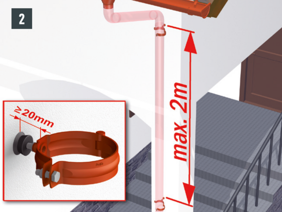 Rørbøjlerne skal monteres, så der overholdes en afstand på mindst 20 mm mellem rørets bagside og facaden. Den indbyrdes afstand mellem rørbøjlerne må ikke være mere end 2 m. (Nationale standarder og tekniske forskrifter kan tillade større afstande. På grund af længden på PREFA-nedløbsrør på 3 m har en afstand på maks. 2 m vist sig at være praktisk.)