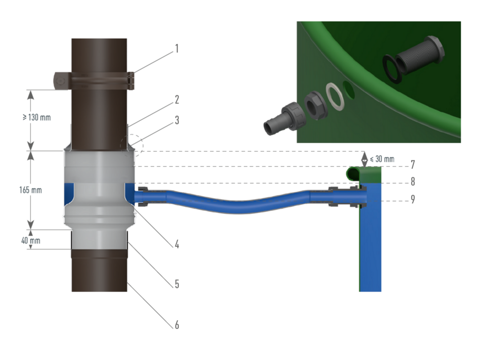Gennem regnvandssamleren fyldes regntønden med regnvand direkte via nedløbsrøret ved nedbør, og den opsamler vandet indtil den ønskede højde.