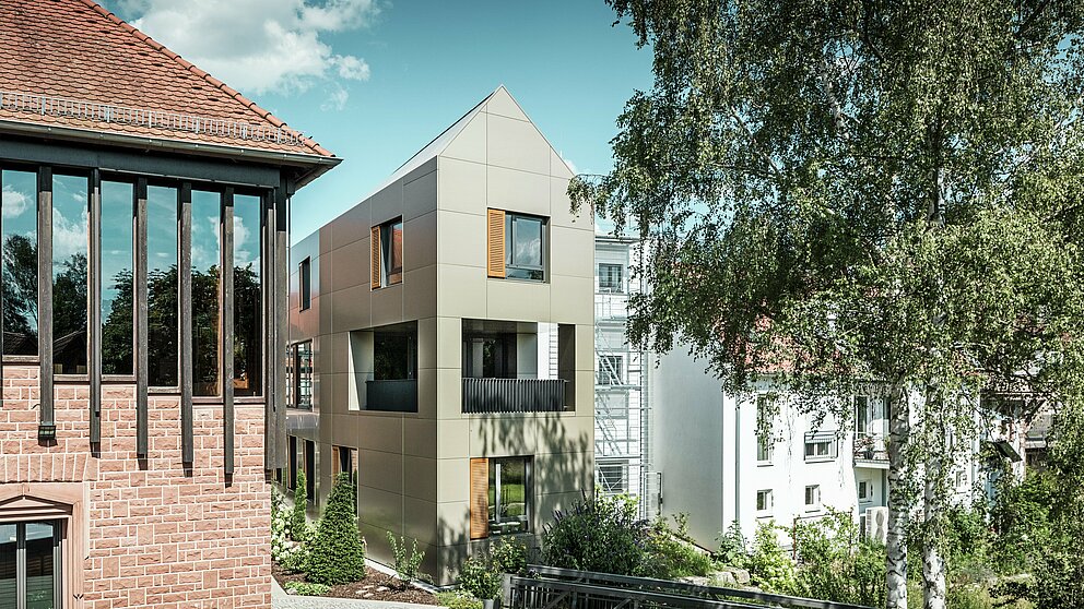 Arkitekturen i det nye rådhus gør indtryk med sit moderne og monolitiske design. Bygningen er udstyret med et asymmetrisk saddeltag, som understreger det moderne design. I stedet for de bindingsværks- eller sandstensfacader, der ellers er typiske for regionen, valgte arkitekterne bronzefarvede PREFABOND-aluminiumskompositplader. De giver bygningen et tidløst design og får den til at skille sig markant ud fra omgivelserne. Det nye rådhus passer dermed perfekt ind i byens bygningsensemble, som består af det oprindelige historiske rådhus og en tilbygning fra 1980’erne.