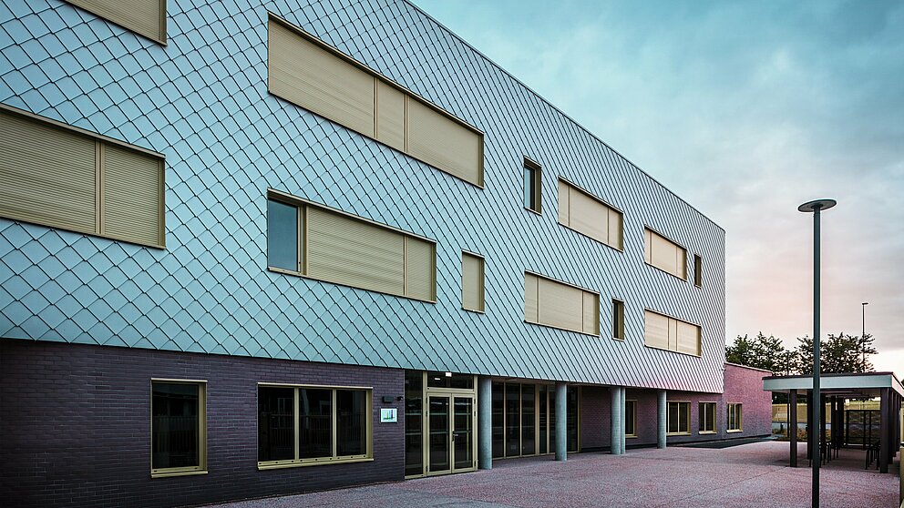 Løsningen blev fundet ved at kombinere to materialer: brunlige klinker omkring soklen og en sølvglitrende aluminiumsfacade i overetagerne. Den todeling giver bygningen en vis elegance og er kendetegnet af både robusthed og praktisk anvendelighed. Den yderste skal er sammensat af omkring 15.000 PREFA-vægromber 29 × 29 i sølvmetallic. Det er over 1.375 kvadratmeter aluminium, som er planlagt, fremstillet og monteret. Det changerende metal fungerer overbevisende med sin livlige overflade, der glitrer i forskellige himmelfarver afhængigt af lyset.