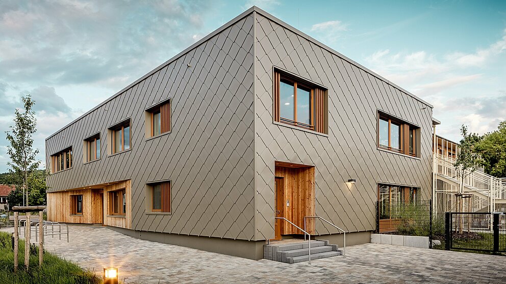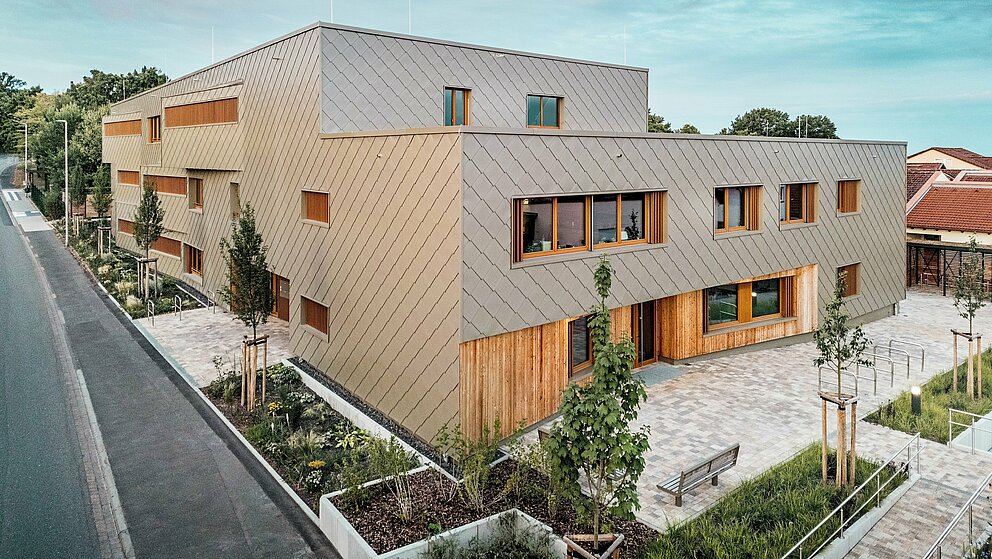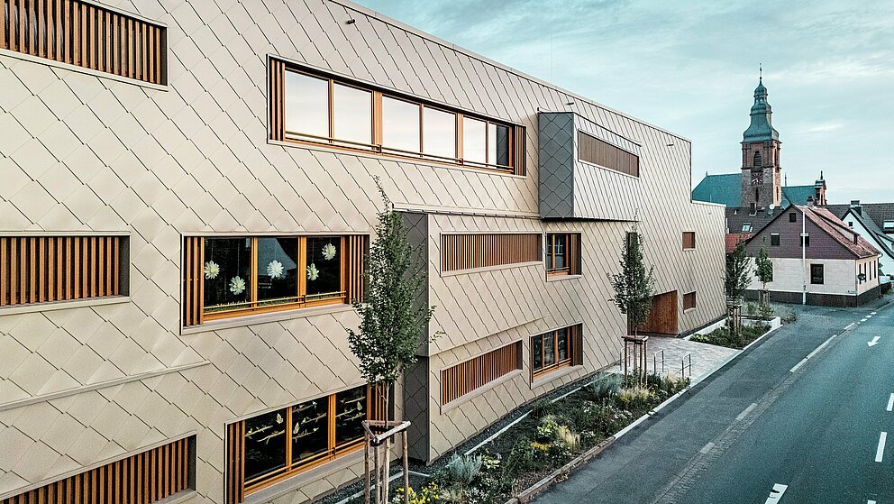 De forskellige plantegningsgeometrier og statiske gitre, forskellige rørføringer og vægtfordelingen på de nederste etager præsenterede udfordringer. Den fremskudte aluminiumsfacade bestående af PREFA vægromber 44 × 44 i bronze skulle visuelt forbinde de forskellige funktionsområder i hybridbygningen med hinanden til en harmonisk enhed. "Når man ser på hele livscyklussen, er PREFA simpelthen foran med hensyn til energiforbrug og genanvendelighed," siger Claudia Härtner rosende om facadesystemet – velvidende den økologiske værdi af ressourcebesparende og klimaaktive byggematerialer, som altid skal ses i sammenhæng med det specifikke anvendelsessted.