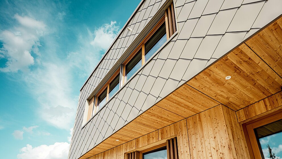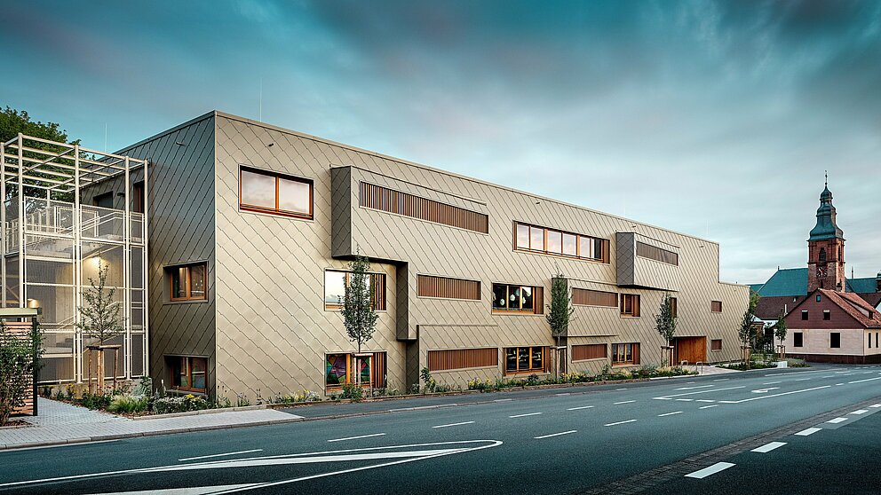 Den bronzefarvede aluminiumskappe blev lagt på bygningen af blikkenslagervirksomheden ASA Schüßler. Den traditionsrige frankiske virksomhed havde allerede gennemført det andet PREFARENZEN projekt i Alzenau. Til hybridbygningen blev der installeret cirka 3.500 af de 44 × 44 centimeter store PREFA-vægromber i bronze – hver enkelt skjult med PREFA rillesøm på træforskallingen. Bygningernes mange hjørner og vinduesrammer er besat med lommeprofiler og standard-hjørnevinkler.