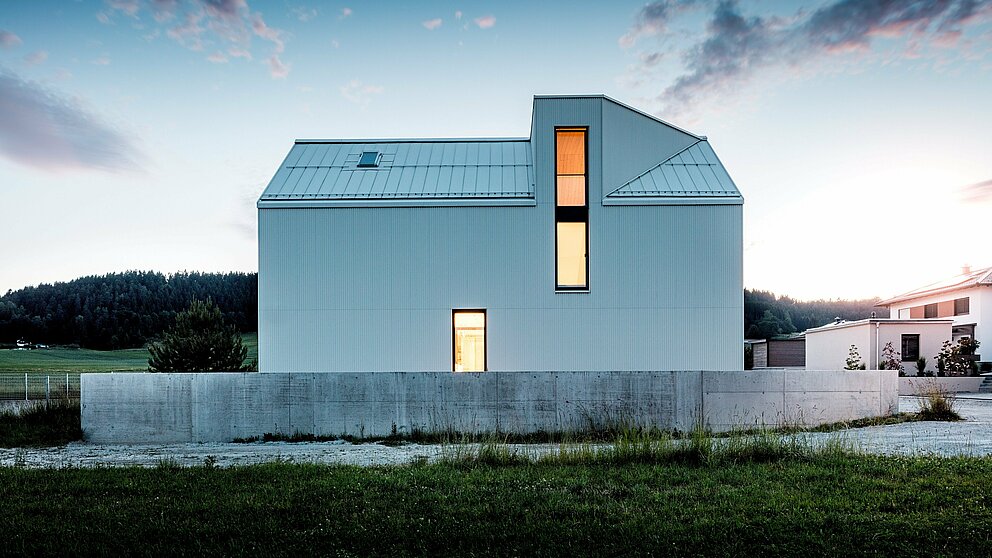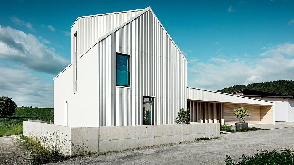 "Mindre er mere", det vidste Mies van der Rohe allerede. Men bag den tilsyneladende enkelhed finder man de fleste steder bygningsmæssig kompleksitet. For eksempel er stabiliteten af farveværdien til det gennemgående monokrome udtryk den grundlæggende forudsætning for bygningens visuelle robusthed. Derfor besluttede arkitekterne sig fra et tidligt tidspunkt for en ventileret PREFALZ-facade i ren hvid – raffineret foldet i et siksak-mønster for at give huset moderne elegance.