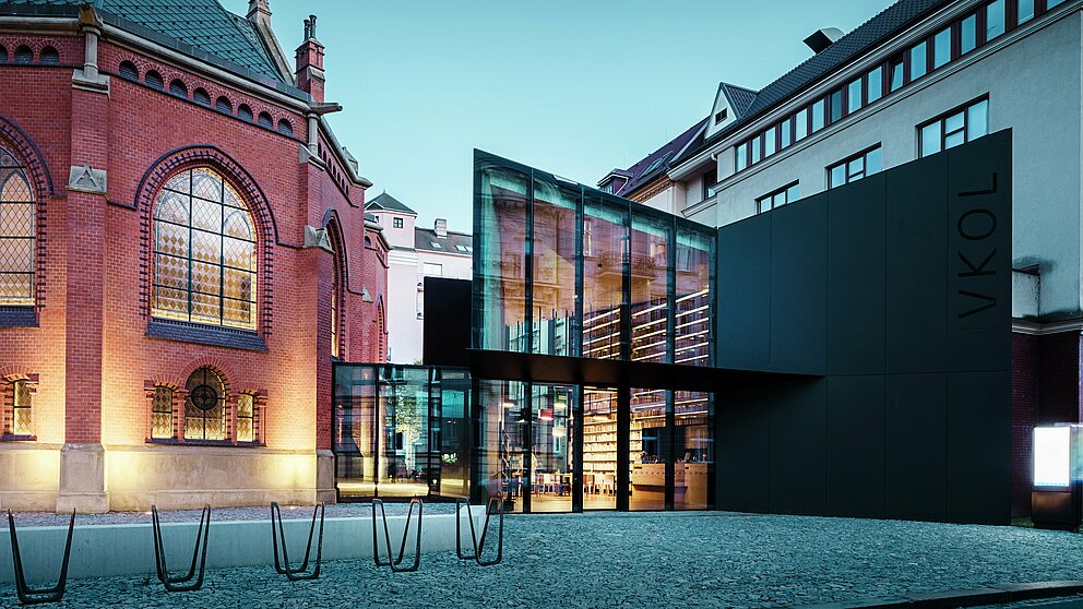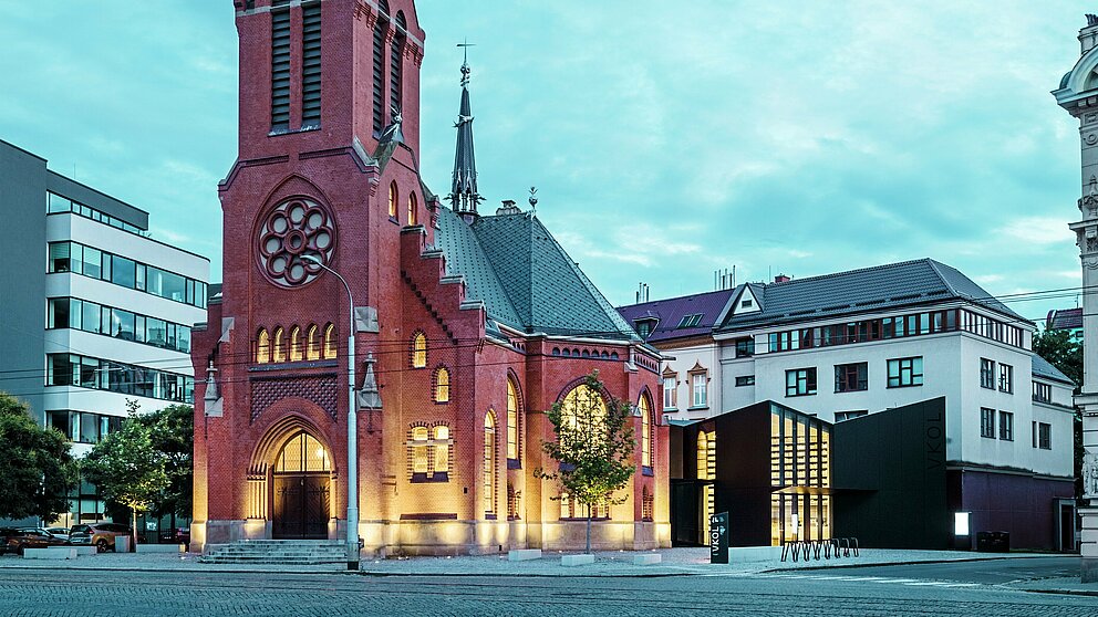 Hvis man går gennem Olomouc, så mærker man med det samme den særlige atmosfære omkring den historiske bydel, den Røde Kirke og forskningsbiblioteket. Lige her blev der i 2023 opført et nybyggeri, der forbinder begge bygninger på en udtryksfuld måde. Atelier-r, s.r.o supplerede de historiske dele med en bygning, der respekterer de gamle omgivelser og samtidig tilfører en tidssvarende form. Arkitekten Miroslav Pospíšil beskriver designet som et byggeri mellem fortid og nutid, hvor kirken skulle beholde hele sit ydre udseende, og den nye bygning skulle få et roligt, personligt udtryk.