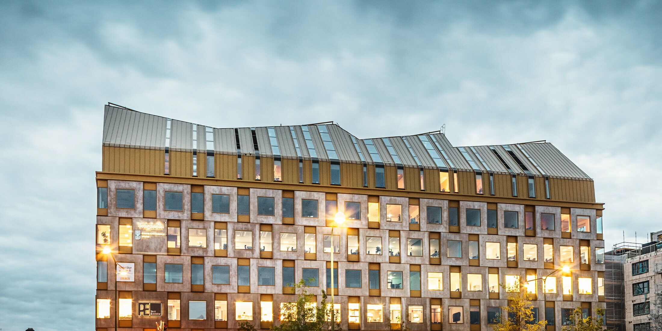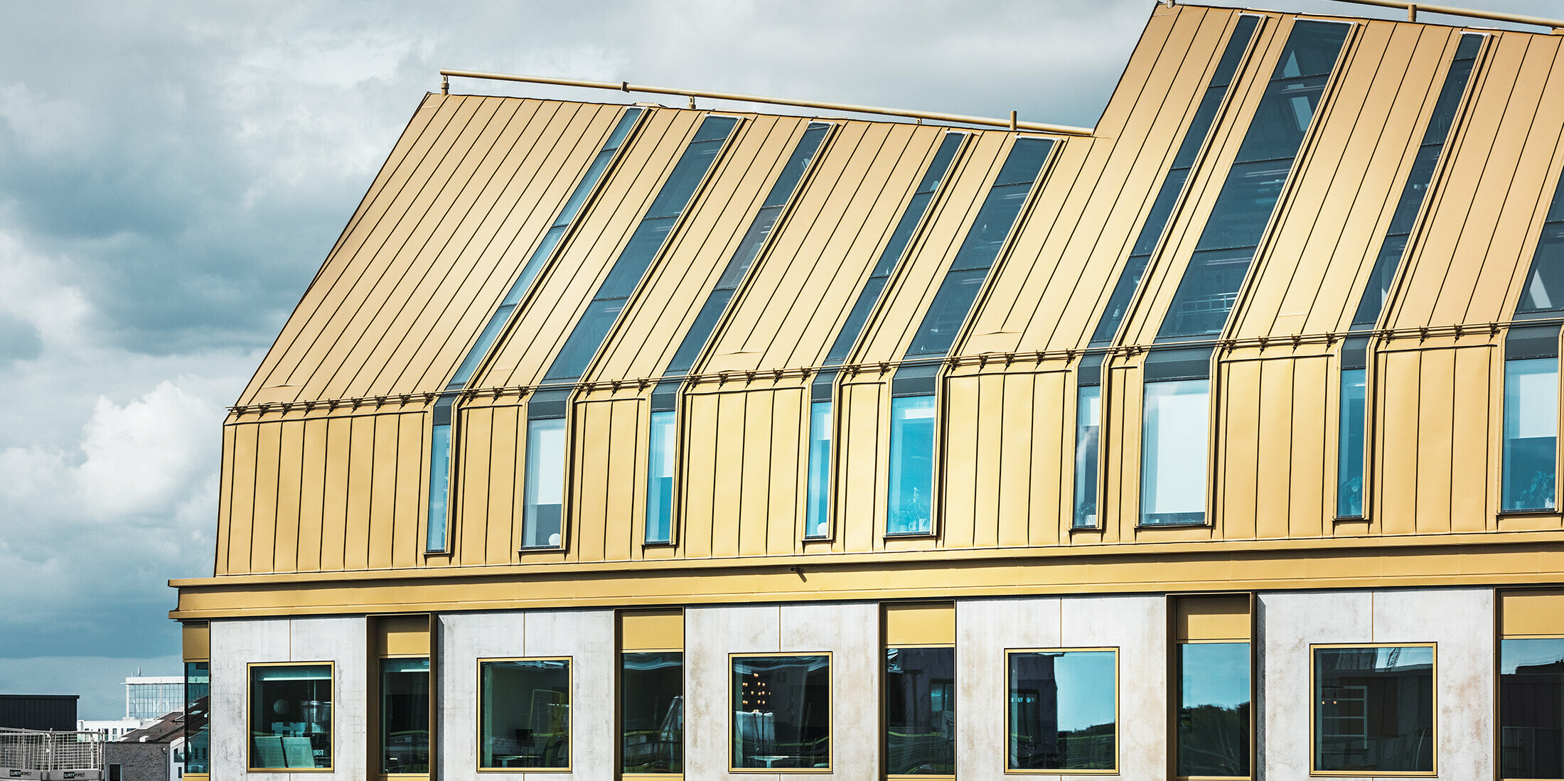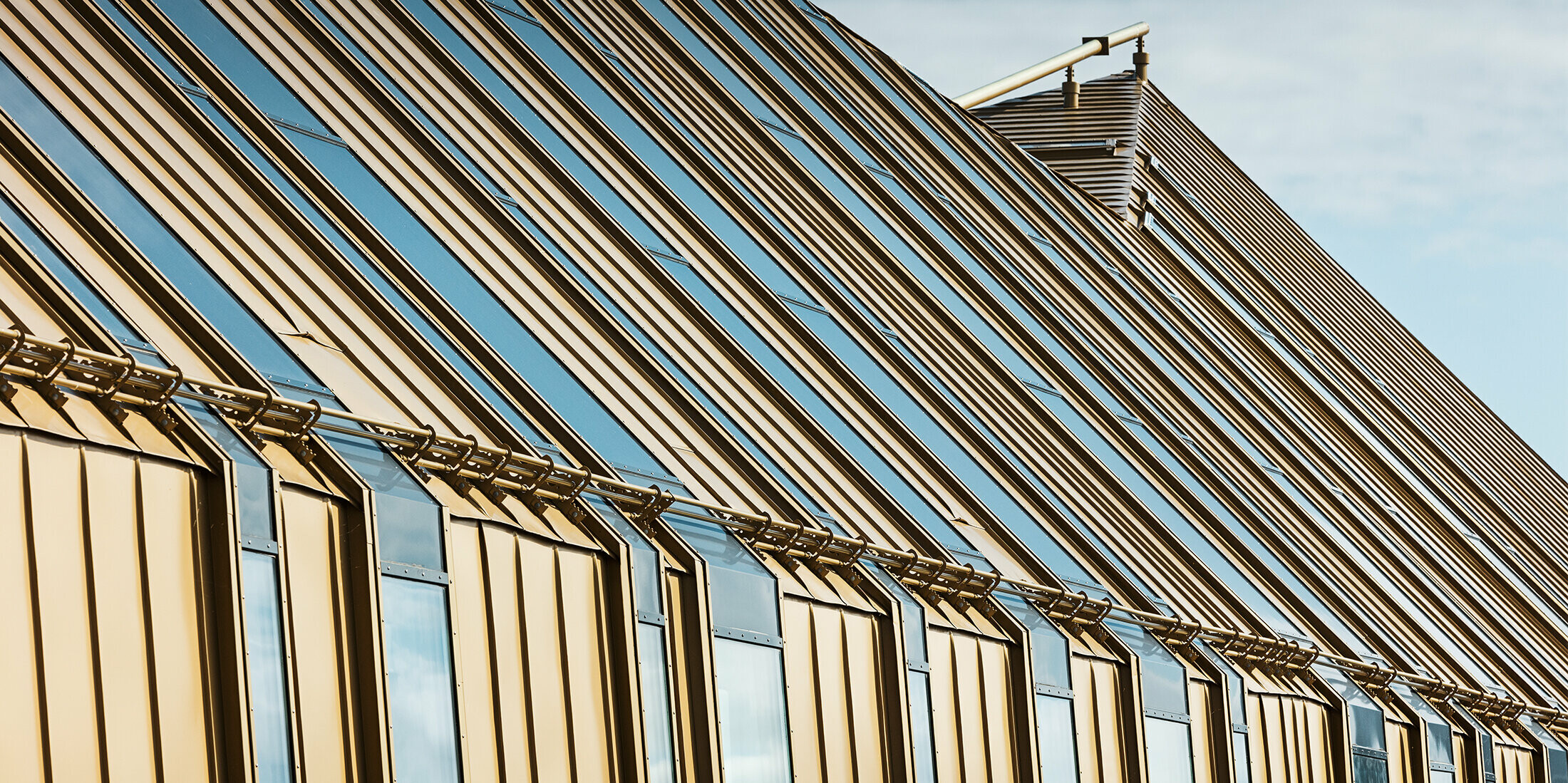 Tagets bærende stålkonstruktion er beklædt med 2000 m² PREFALZ, hvis belægning er en specialproduktion fra PREFA. Den nyudviklede specialfarve hedder Gold Jaisalmer-2525, navngivet efter den indiske ørkenby Jaisalmer, hvis ry som gylden by var forbilledet for belægningens glitrende farve.