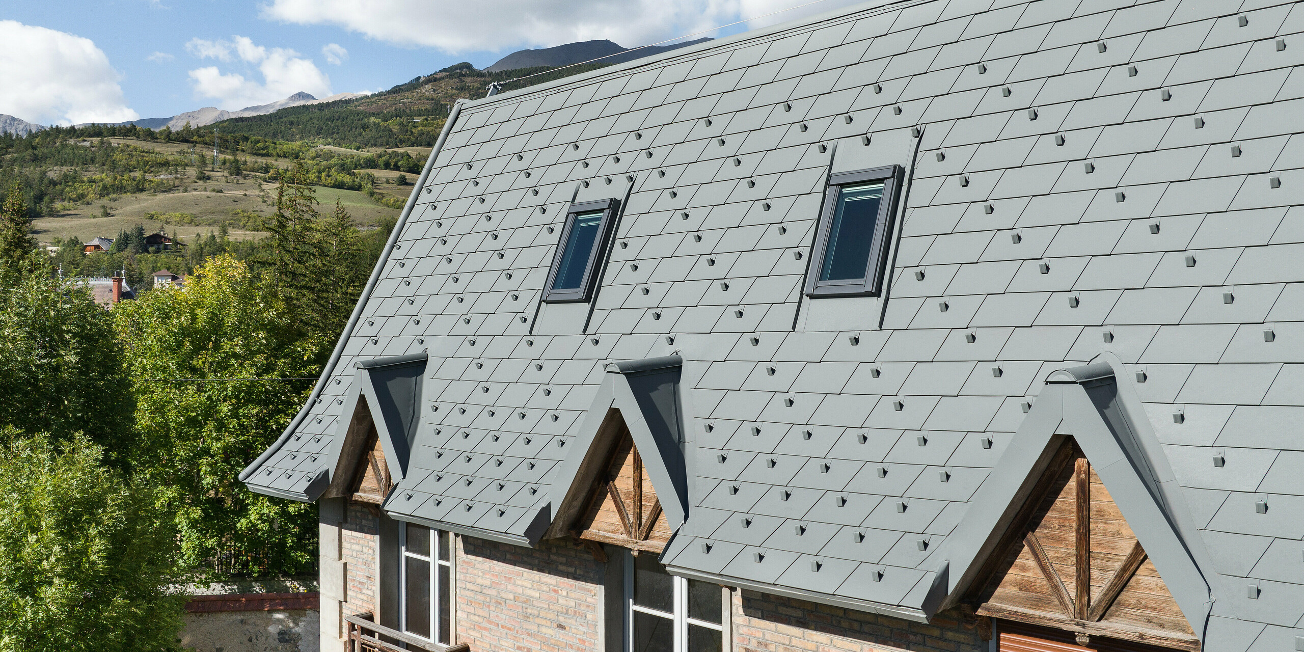Taglandskabet på en ejendom i Barcelonnette, Frankrig, er renoveret med PREFA tagspåner i P.10 lysegrå. PREFA tagspåner i lille format blev valgt til det omfattende renoveringsprojekt, da de er velegnet til forskellige tagformer på grund af deres fleksible forarbejdningsmuligheder.