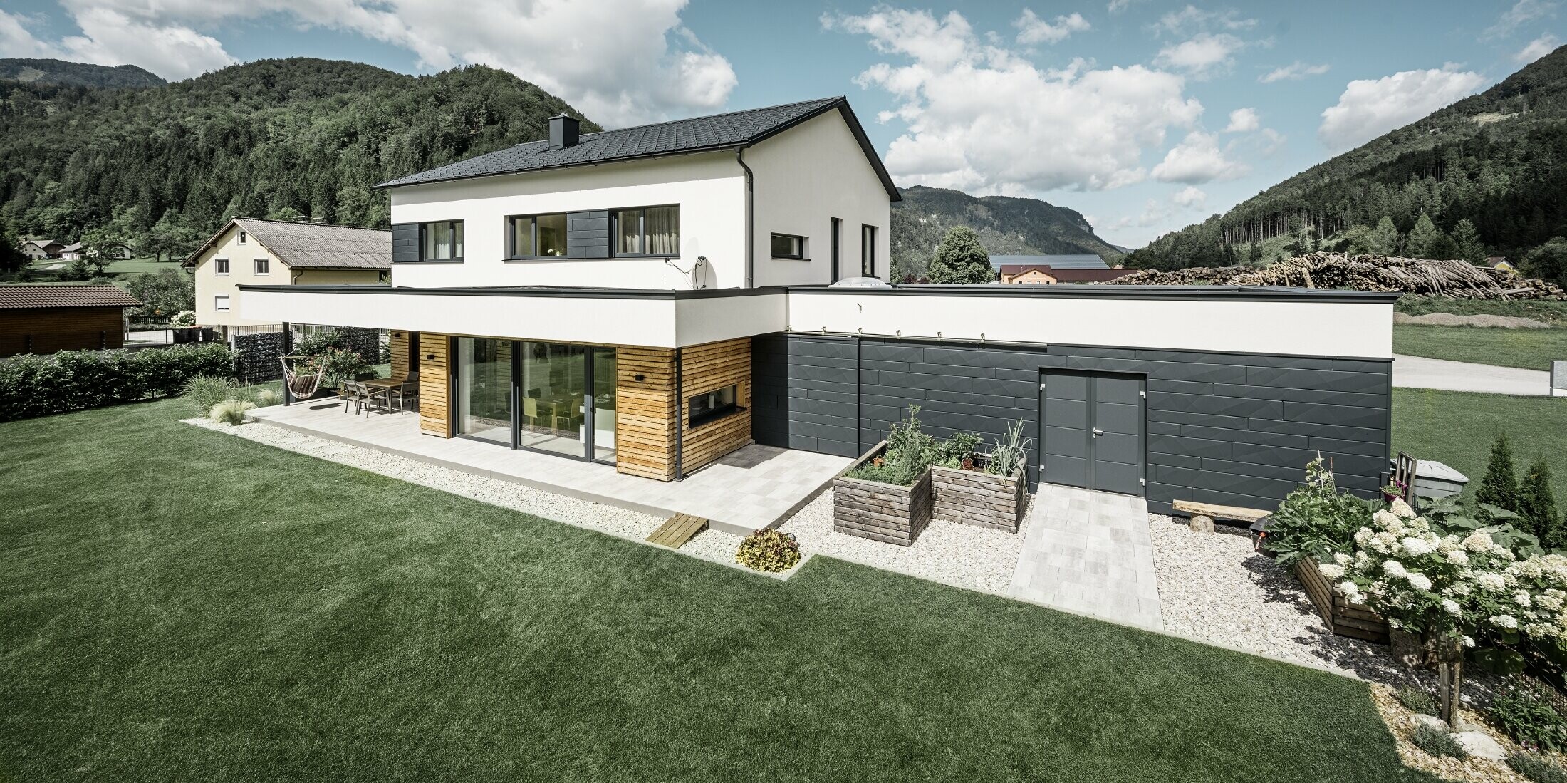 Enfamilieshus med mange flotte detaljer: Her kombineres en træfacade, alufacade (Siding.X i P.10 antracit) og pudset facade ideelt. Et rigtigt blikfang er også den optiske forbindelse mellem vinduerne på overetagen med Siding.X.