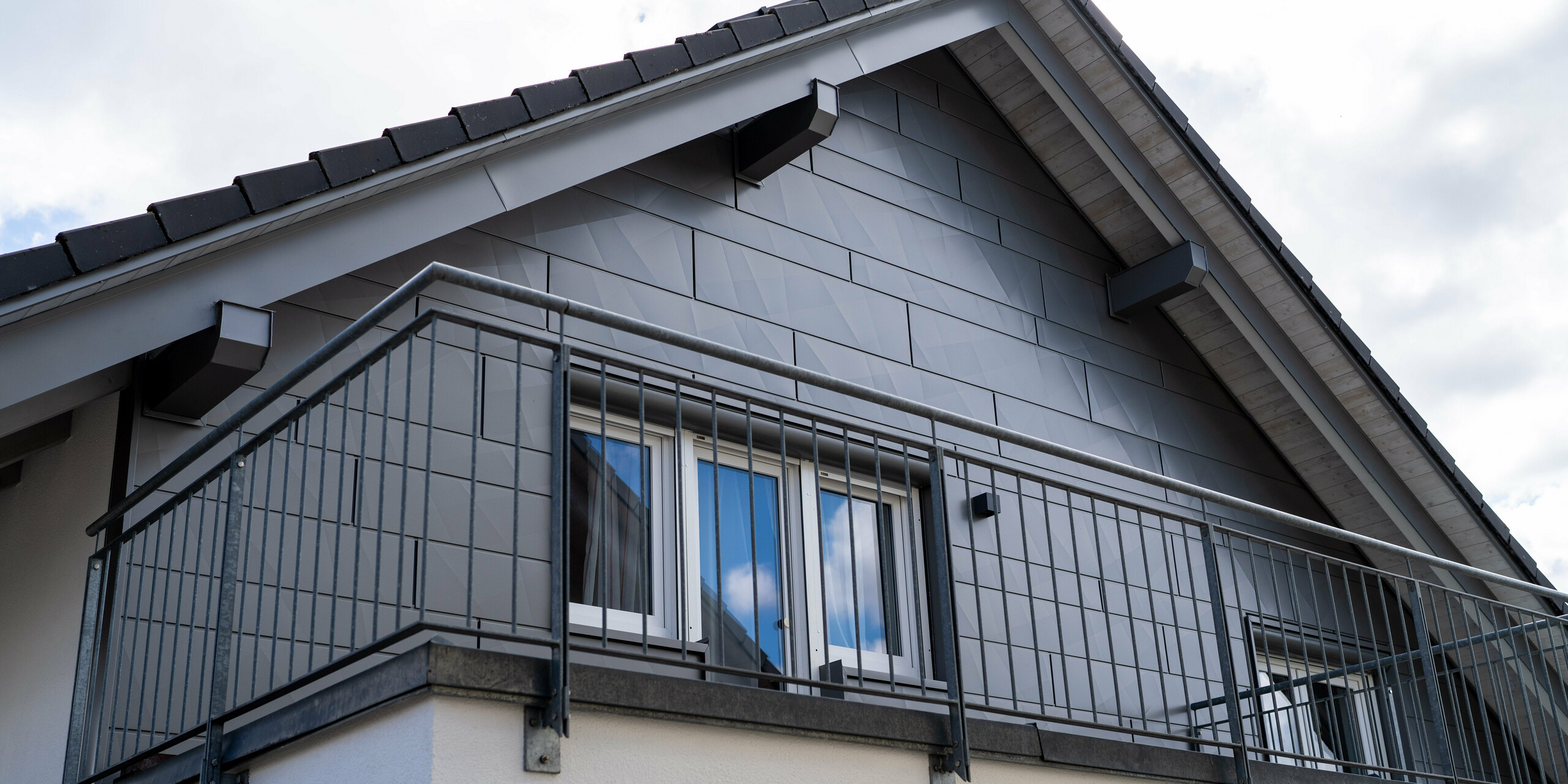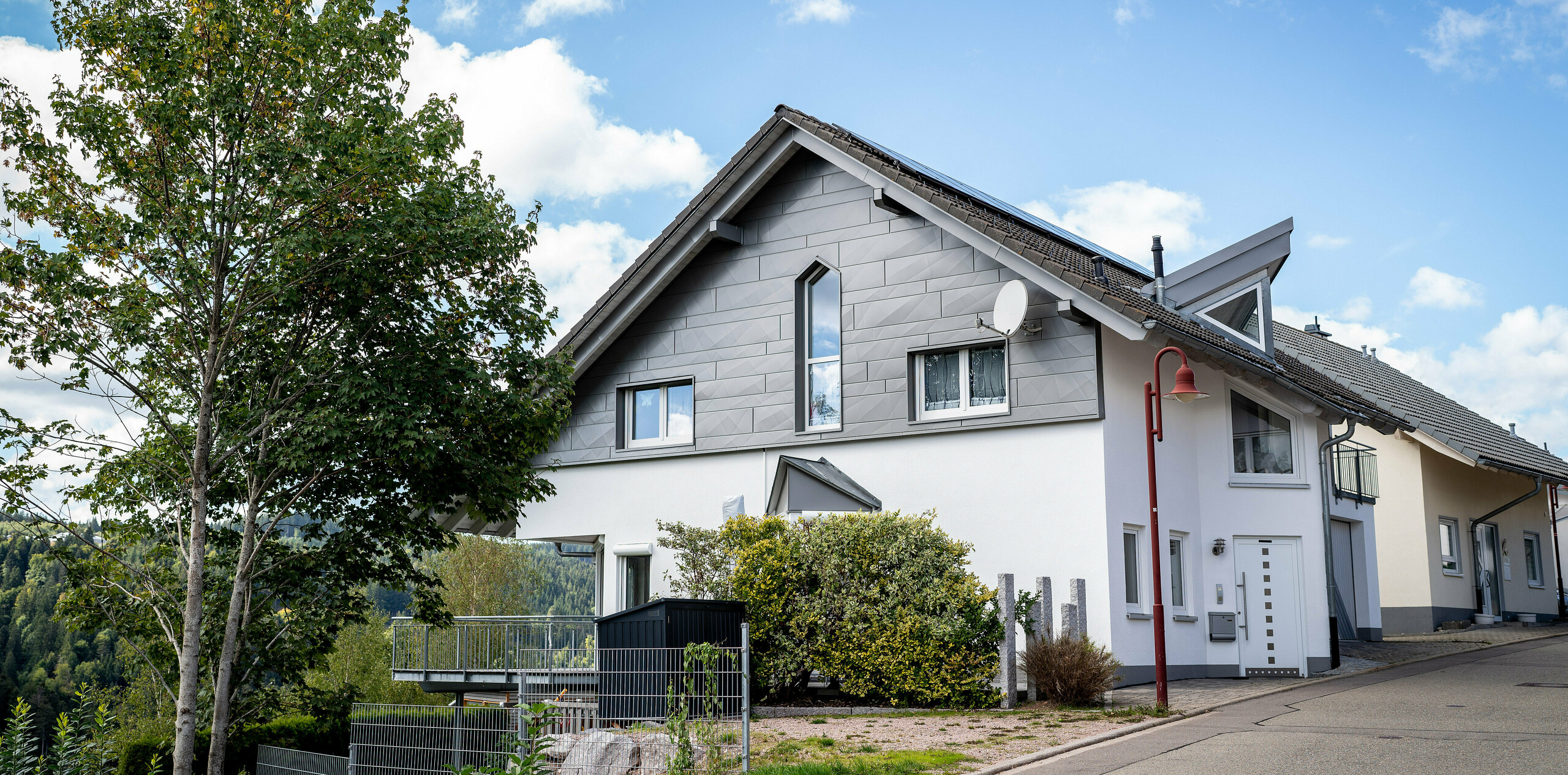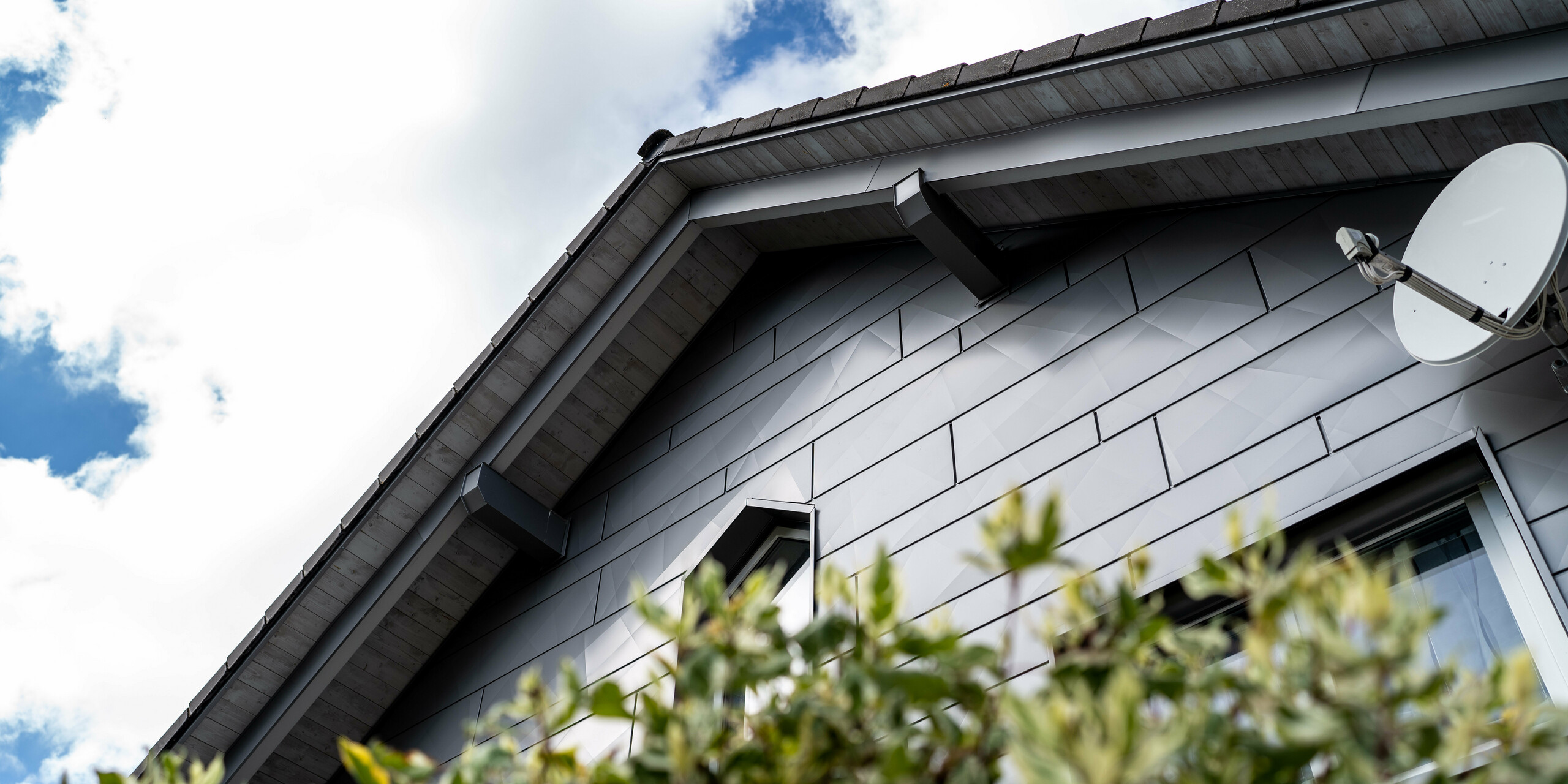 På dette enfamilieshus fik gavlen, der oprindeligt blev bygget med træbeklædning, ny beklædning med næsten vedligeholdelsesfrit aluminium fra PREFA – Siding.X i røgsølv.