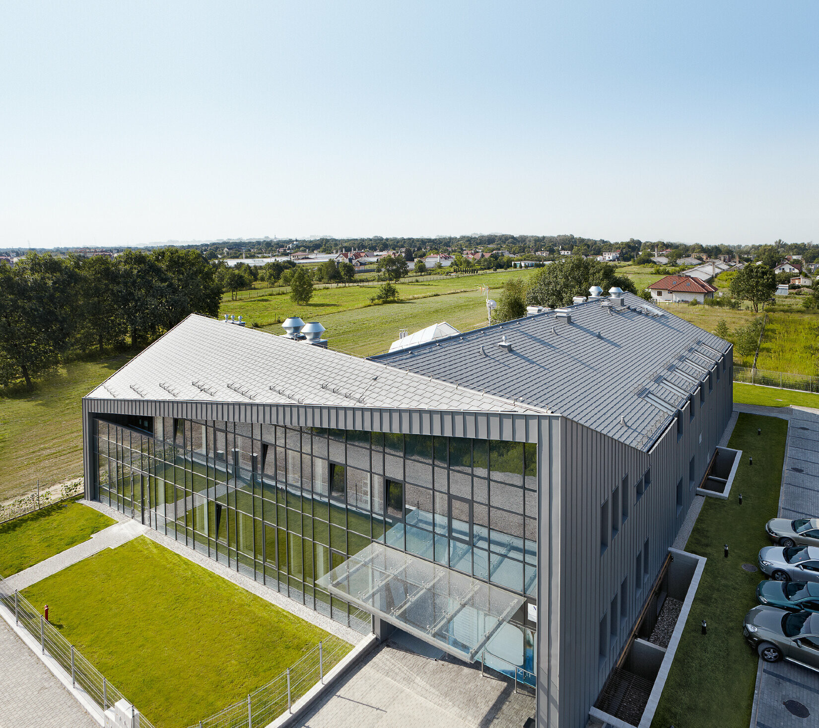 Lægehus i Osteon i Polen med PREFALZ og tagspån i lys grå