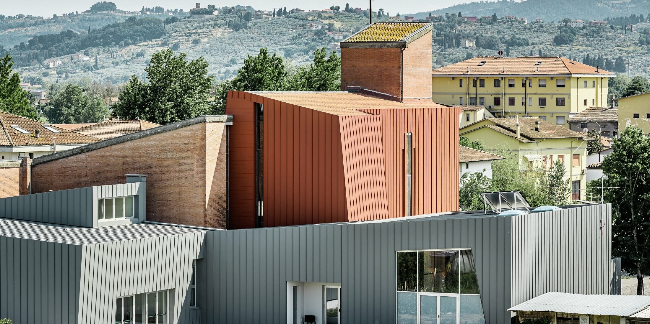 Samtidig blev væggene i den nye kirke, som var præget af betydelig forvitring, genbrugt ved hjælp af den samme tilbygningsteknologi, men med anden farve og facadebeklædning. Store flader og skrå vægge er beklædt med PREFALZ-baner i P.10 lys grå og teglrød. Målet med projektet var at skabe udvendige forbindelsesområder, mødezoner og et kontinuum mellem den gamle kirke (1383), kirkegården, tilbygningen, den nye kirke og haven som et socioreligiøst centrum og samlingssted.